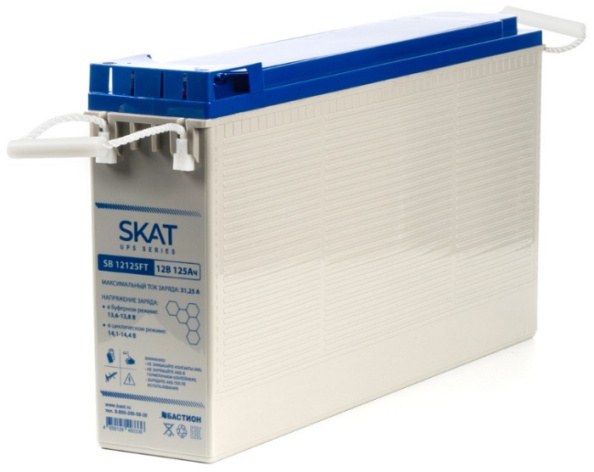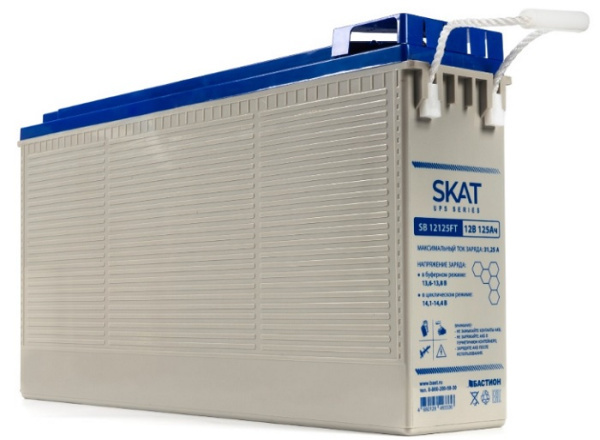 Аккумулятор герметичный свинцово-кислотный необслуживаемый SKAT SB 12125FT, производимый по технологии AGM (Absorbent Glass Mat) с системой рекомбинации газов VLRA, предназначен для использования в составе системы резервного питания.