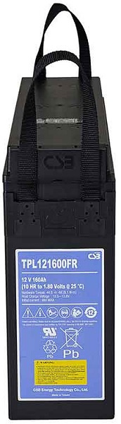 Фронт-терминальный аккумулятор CSB TPL 121600FR (ёмкость 160 Ач, напряжение 12 В) разработан специально для установки в 19” и 23” шкафы и стеллажи. Компактные размеры обеспечивают максимальную плотность энергии на минимальной площади. TPL 121600 FR отличается высокой надёжностью и длительным сроком службы (до 12 лет при правильной эксплуатации), на протяжении которого долив воды не требуется. Жидкий электролит обездвижен стекловолоконными сепараторами (absorbed glass mat), что повышает тепловую устойчивость батарей. Фронт-терминальное расположение клемм существенно упрощает монтаж и обслуживание.