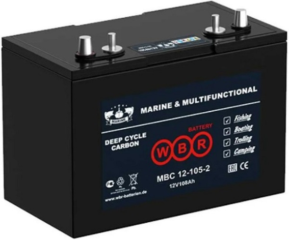 Акб WBC MB12-105-2 - свинцово-кислотный карбоновый (Carbon), высоко-цикличный выполненный по технологии AGM лодочный аккумулятор. Обеспечивает высокую цикличность и продолжительный срок службы, до 10 лет при соблюдении правил эксплуатации. Акб WBR MBC 12-105-2 разработан специально для использования эхолотов, электронасосов, приборов освещения, катерах, моторных лодках и другого оборудования. Доливать воду в аккумулятор не требуется. Корпус герметичен и выполнен из прочного и долговечного ABS пластика.