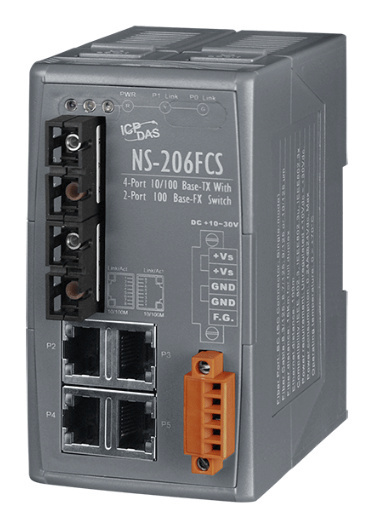 Промышленный 6-портовый неуправляемый коммутатор: 4 порта 10/100 Base-T Ethernet, 2 порта 100BaseFX (одномодовое волокно, разъем SC, до 30 км).