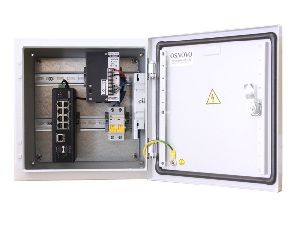 Станция Osnovo OS-331 предназначена для защиты монтируемого на улице оборудования и состоит из всепогодного герметичного шкафа и оптического кросса — разъемного соединения многоволоконного оптического кабеля с встраиваемым устройством.