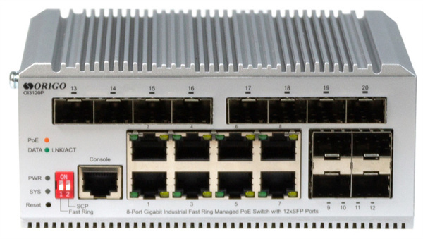 Коммутатор ORIGO OI3120P/185W предназначен для построения защищенных отказоустойчивых сетей передачи данных и организации питания энергоемкого PoE-оборудования на объектах с повышенными требованиями к условиям эксплуатации. Порты 1 – 8 поддерживают стандарты IEEE 802.3аf/at PoE с возможностью подачи питания до 30 Вт на порт при общем PoE-бюджете 185 Вт.