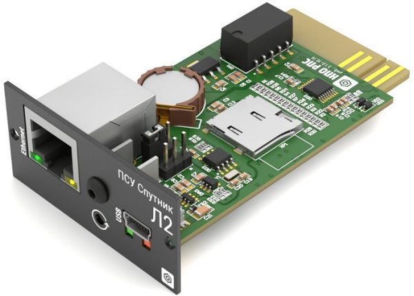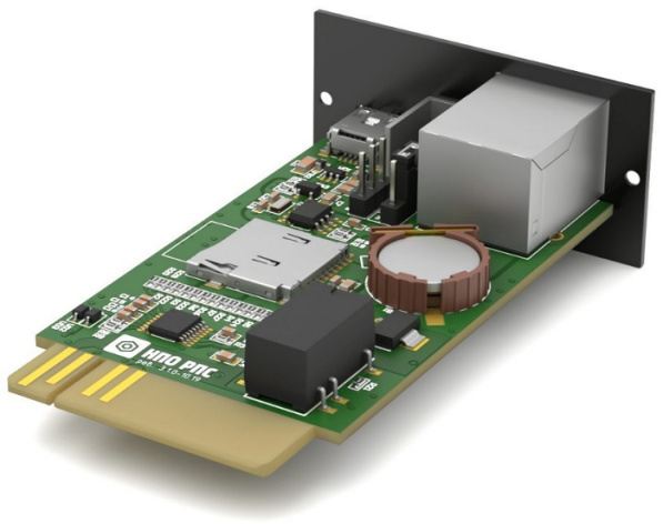 Плата сетевого управления для источников бесперебойного питания (ИБП) производства НПО РПС, предназначенная для мониторинга и управления однофазными ИБП типа "линейно-интерактивный" и "онлайн" (с двойным преобразованием). Эта модель является компактным вариантом из линейки плат сетевого управления ИБП.