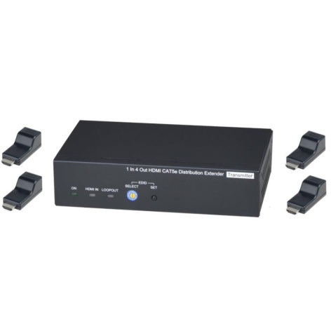 Комплект (удлинитель-распределитель+4 приёмника) HDMI 1.4 (1 вход/4 выхода) с передачей по кабелю витой пары CAT5e на удалённые приёмники.