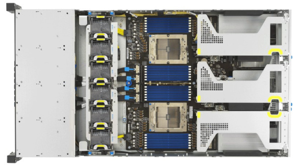 Двухпроцессорная серверная платформа 2U, оптимизированная для работы с тремя двухслотовыми графическими процессорами, поддерживает до 24 модулей RDIMM, восемь накопителей NVMe/SATA/SAS, восемь слотов расширения PCIe 5.0, два OCP 3.0 и поддерживает максимальный TDP до 3 графических процессоров мощностью 400 Вт.