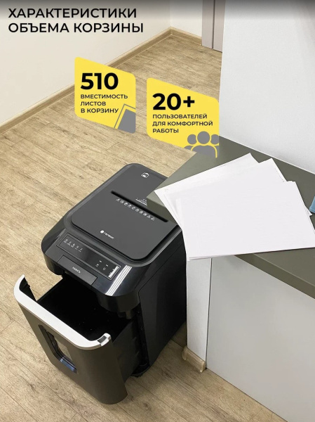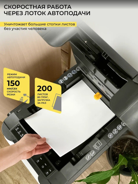 Автоподача до 200 листов 80г/м2. Время уничтожения - 7 мин.