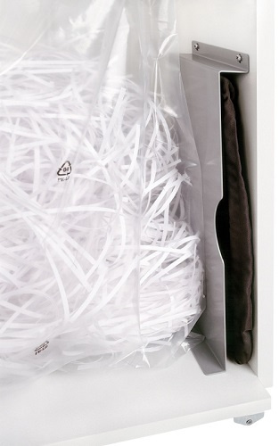 Уничтожитель документов с перекрестной резкой для коллективного пользования в большом офисе. Имеет увеличенную корзину, большое загрузочное отверстие и интегрированную систему электронного управления и экономии электроэнергии EMCS. Сменные мешки для мусора одеваются на металлический каркас, что позволяет комфортно освобождать аппарат от измельченных отходов.