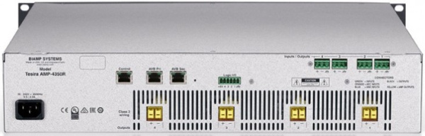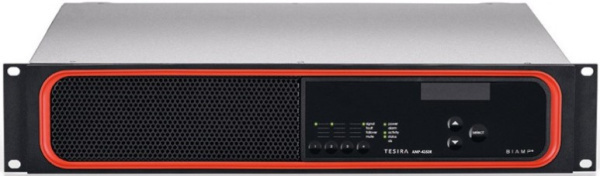 Цифровой усилитель Biamp Tesira AMP-4350R, 4 канала по 350 Вт на 4/8 Ом. Подключение аудиосигналов через интерфейс AVB/TSN (разъем RJ-45). Минимальная нагрузка – 2 Ом. На передней панели усилителя расположен OLED-дисплей, позволяющий отключать трансляцию звука на одном или на всех каналах, регулировать уровень выходного сигнала, а также получить доступ к информации о состоянии усилителя и каналов. Усилитель предназначен для работы в составе системы Biamp Tesira и программируется при помощи ПО Tesira. Для программирования и нормальной эксплуатации усилитель требует наличия в системе хотя бы одного устройства Tesira класса «сервер», которое отвечает за маршрутизацию и обработку цифровых аудиосигналов. Однако во время эксплуатации в случае аварийного отключения устройства класса «сервер» усилитель позволит автономно управлять отключением каналов. Усилитель может осуществлять мониторинг импеданса, а также состояния сетевых подключений AVB/TSN (основного и резервного).