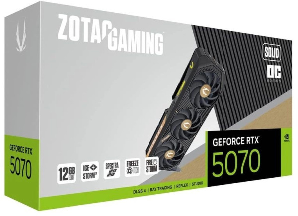 Zotac GeForce RTX 5070 SOLID OC - производительная видеокарта с заводским разгоном, созданная для современных игр и работы с графикой. Оснащена эффективной системой охлаждения, которая обеспечивает тихую работу даже при максимальных нагрузках. Благодаря компактным размерам легко устанавливается в большинство игровых систем. Металлическая задняя панель защищает компоненты и придает видеокарте современный внешний вид. Поддерживает вывод изображения на несколько мониторов одновременно, что делает её отличным выбором для создания мощной игровой системы с повышенной производительностью.