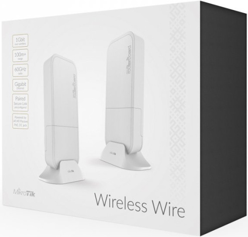 Инновационный комплект из двух сопряжённых радиоустройств wAP 60G обеспечивает гигабитные скорости передачи данных для молниеносных прозрачных соединений между двумя точками без потери скорости в LAN-сети. Wireless Wire работает в диапазоне 60 ГГц и не зависит от перегруженных Wi-Fi частот, обеспечивая защищённый алгоритмом AES-шифрования радиоканала дальностью свыше 200 м.